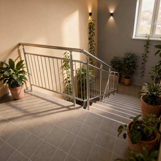 Hliníkové kulaté zábradlí na schody s horním kotvením. Tento model je navržen pro bezpečné a funkční řešení schodišť, s možností přizpůsobení dle konkrétních potřeb místa.