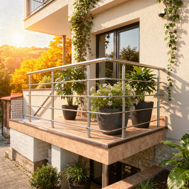 Hliníkové kulaté zábradlí model B1HRB v barvě imitace nerez pro terasu, s horním kotvením. Tento model obsahuje čtyři vodorovné výplně, které přispívají k modernímu a elegantnímu vzhledu.